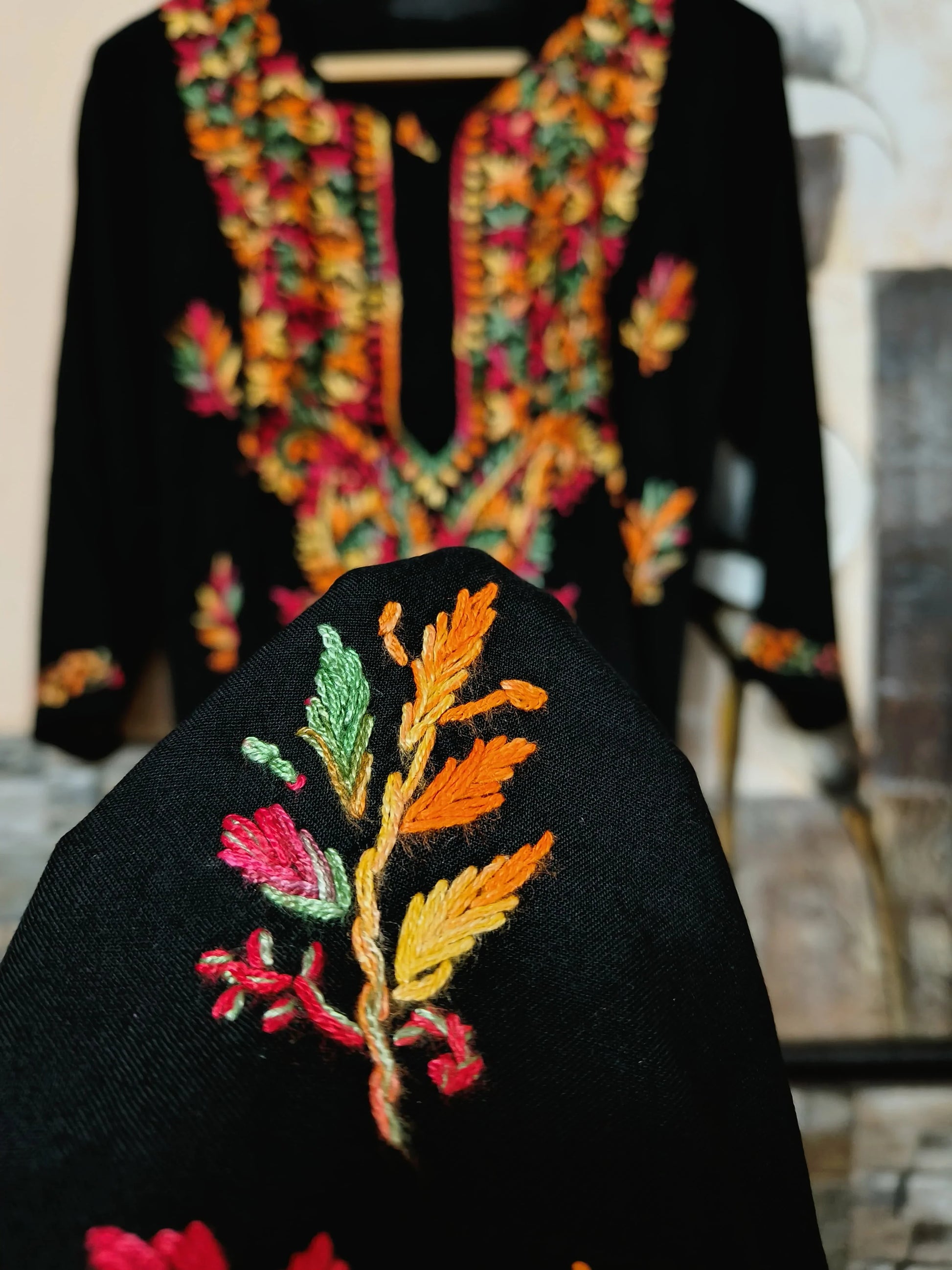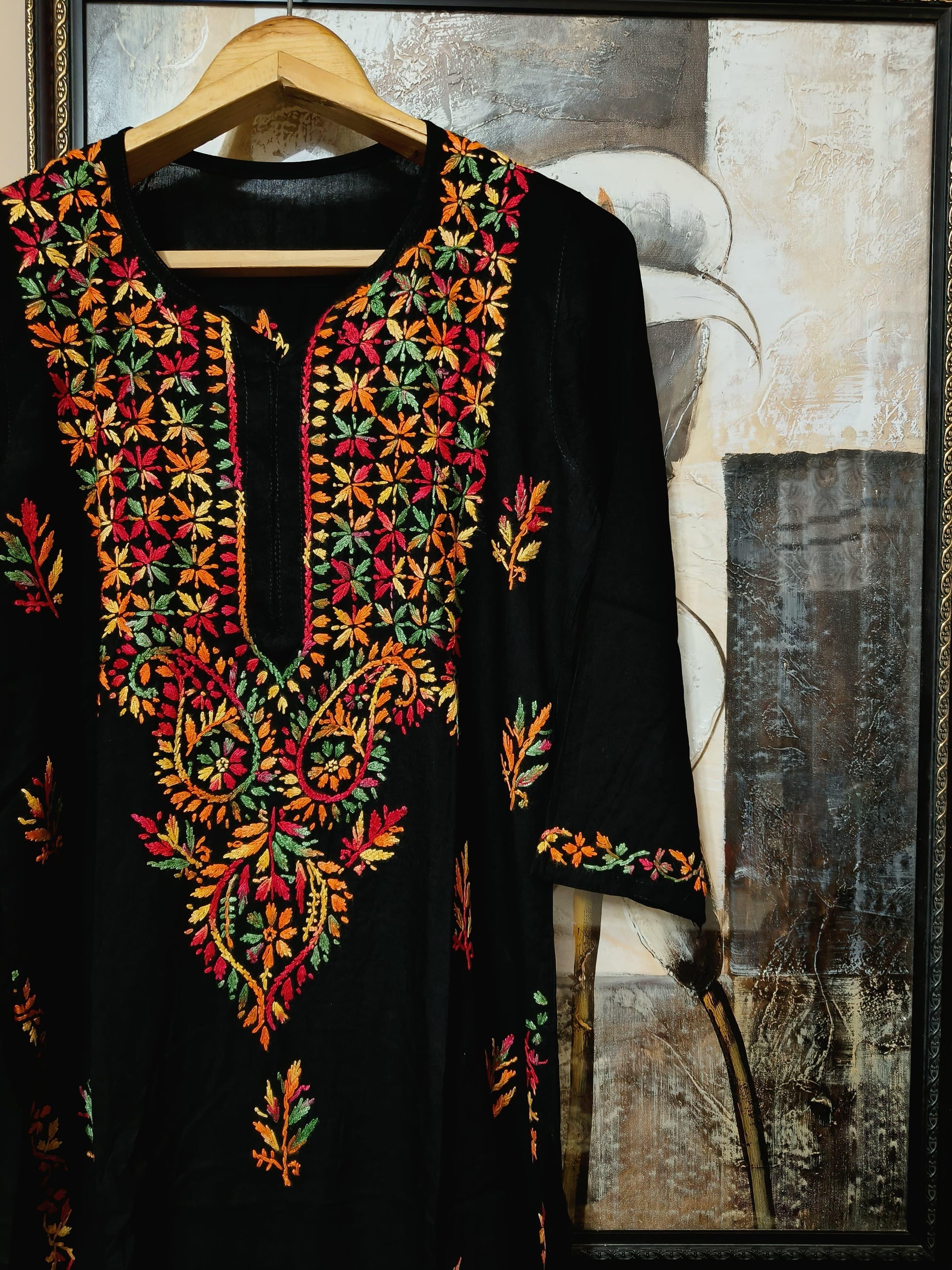 Experience timeless elegance with our Black Multi-Thread Chikan Kurti. This piece is a stunning blend of traditional craftsmanship and modern style, featuring intricate hand-embroidered chikankari patterns crafted with multi-colored threads.