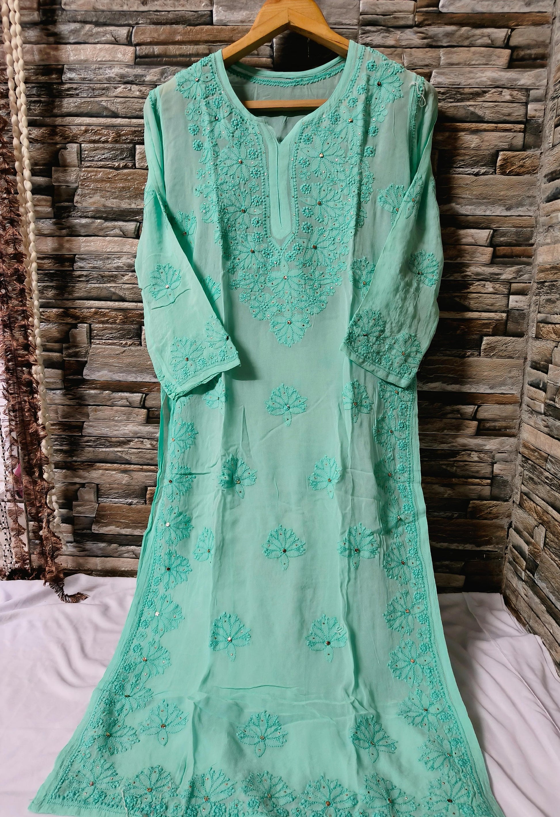 Crafted on soft, breathable Viscose Georgette fabric, this Kurti is a celebration of Lucknowi artistry. The fine Chikankari embroidery tells tales of tradition through floral and paisley motifs, while the addition of Mukesh (badla) work brings a subtle sparkle that catches the light with every movement.
