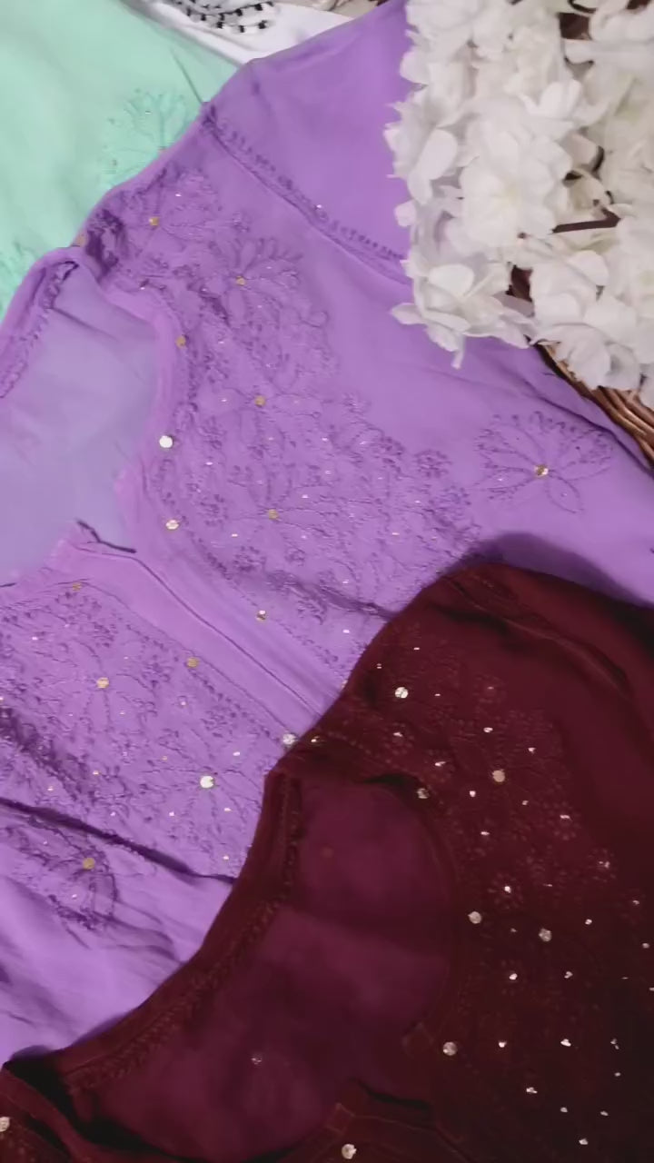 Step into subtle sophistication with our Chikankari Kurti adorned with intricate Mukesh work — where timeless hand embroidery meets delicate shimmer.