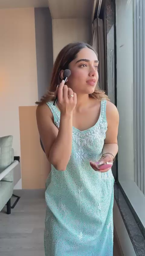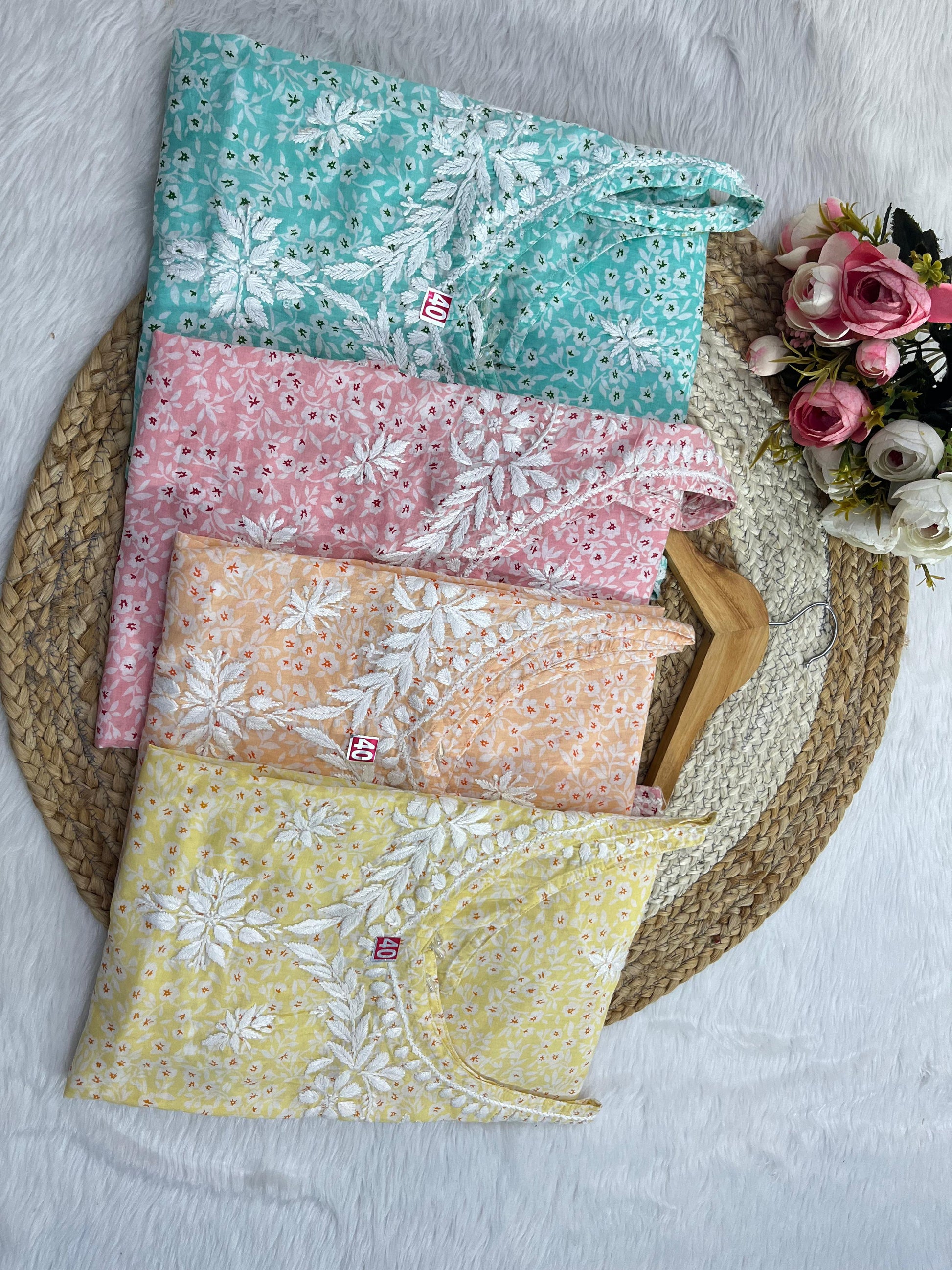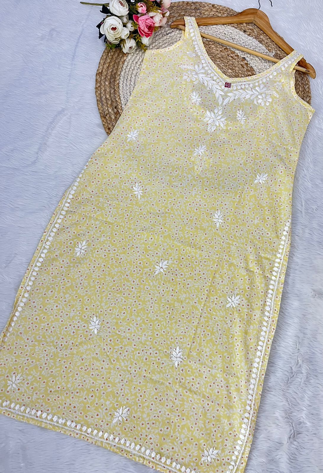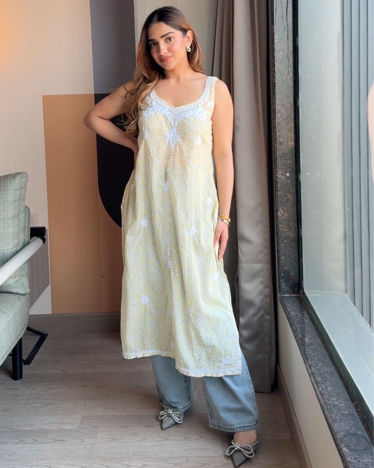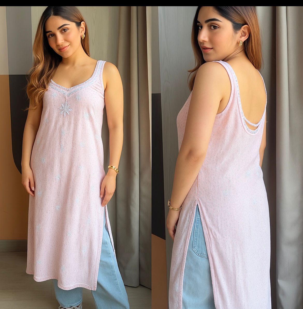 Turn heads with this exquisite backless designer kurti, crafted from the softest pure mulmul fabric. The airy texture ensures unmatched comfort, while the hand-embroidered Chikankari work adds a touch of timeless Lucknowi elegance.