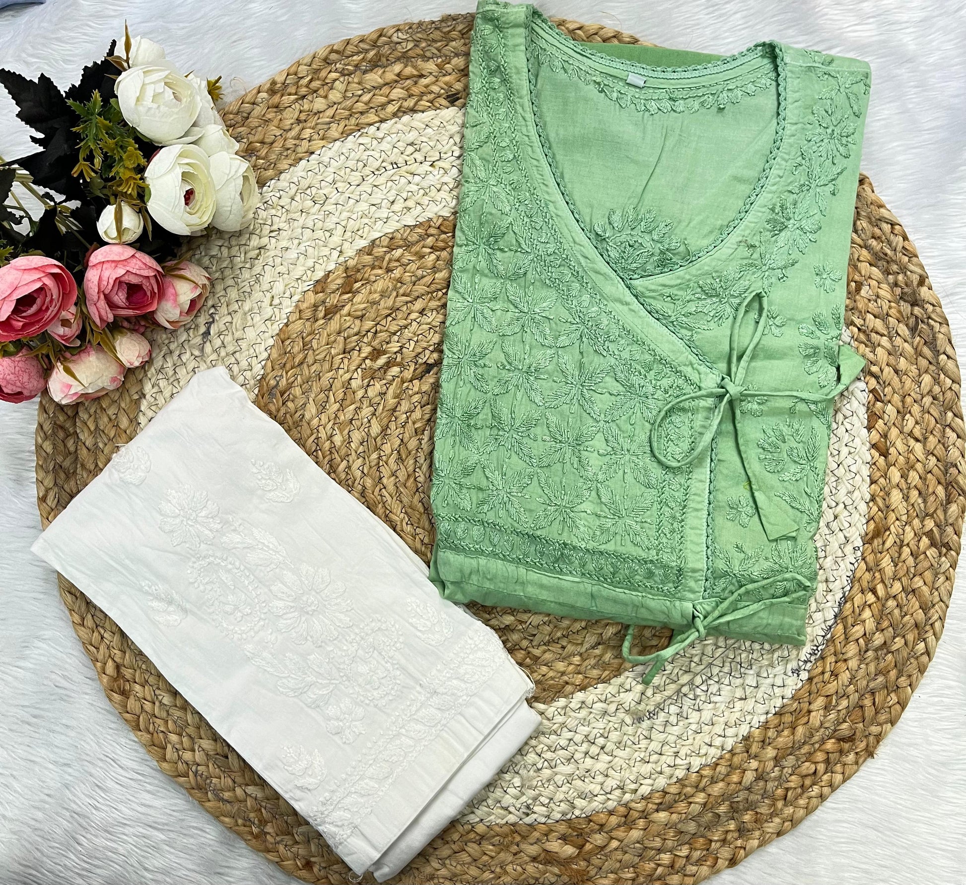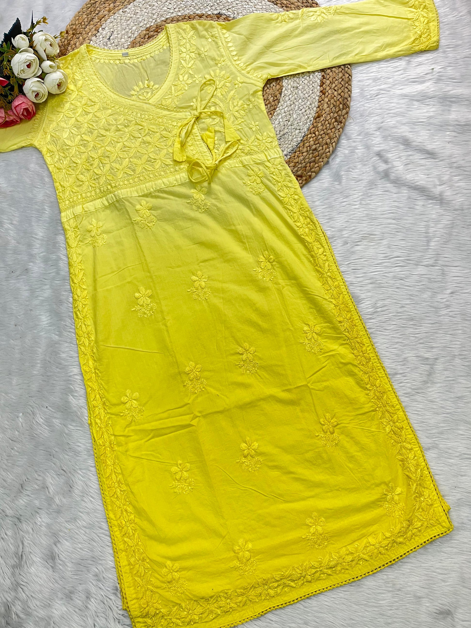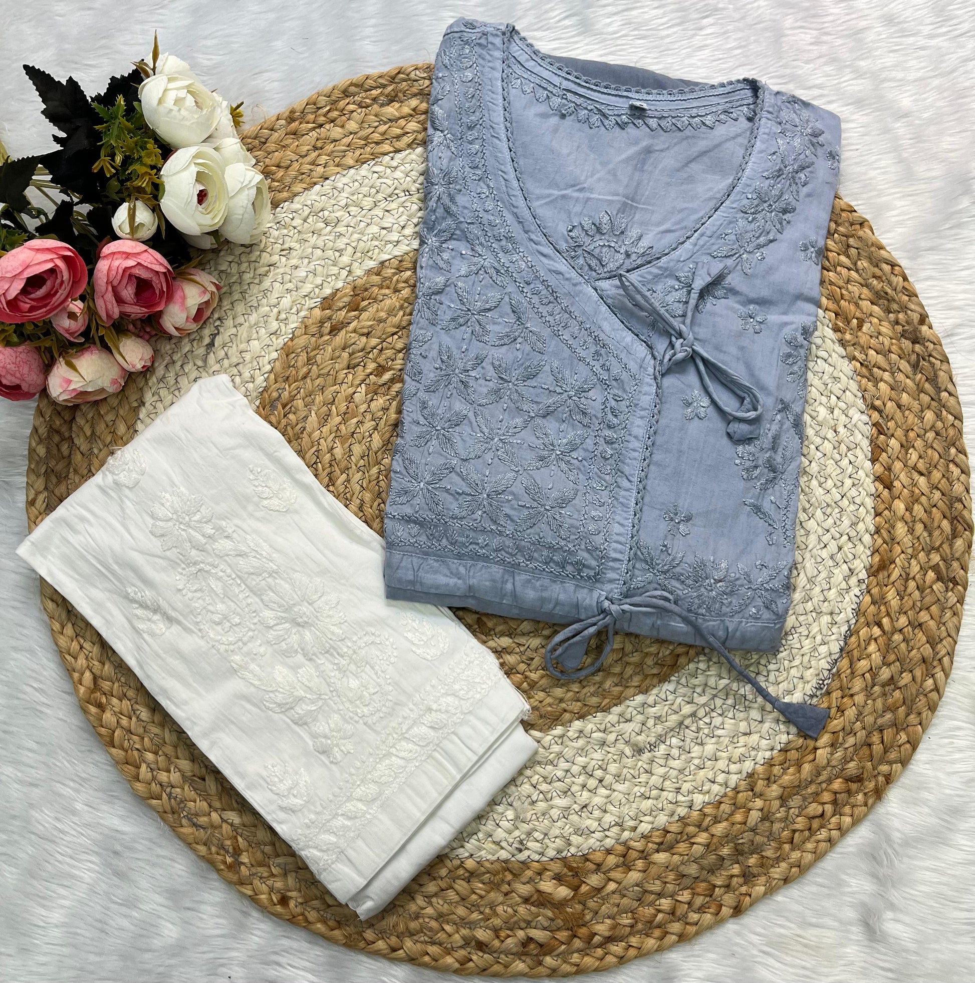 - Design: Featuring intricate Chikankari embroidery, each stitch tells a story of artistry and elegance. The overlapping Angarkha style, complete with delicate tassels or tie-ups, adds a regal touch to this classic silhouette.