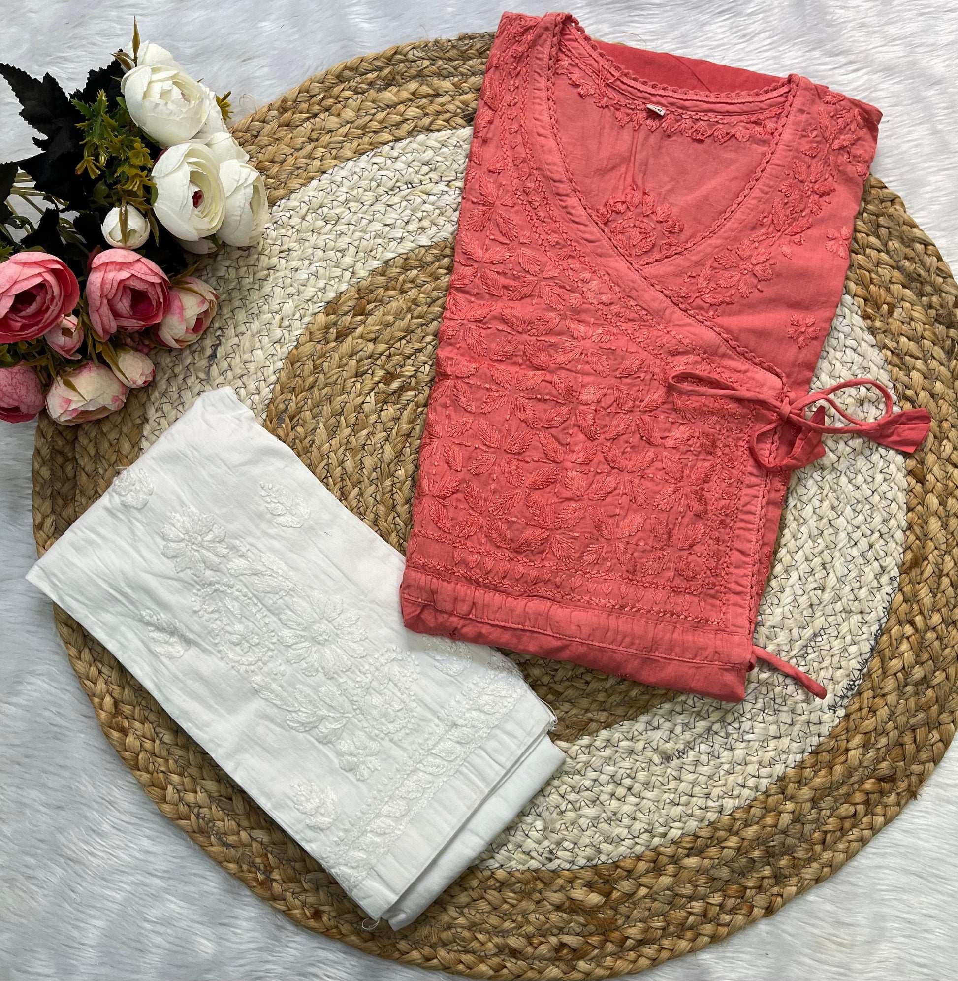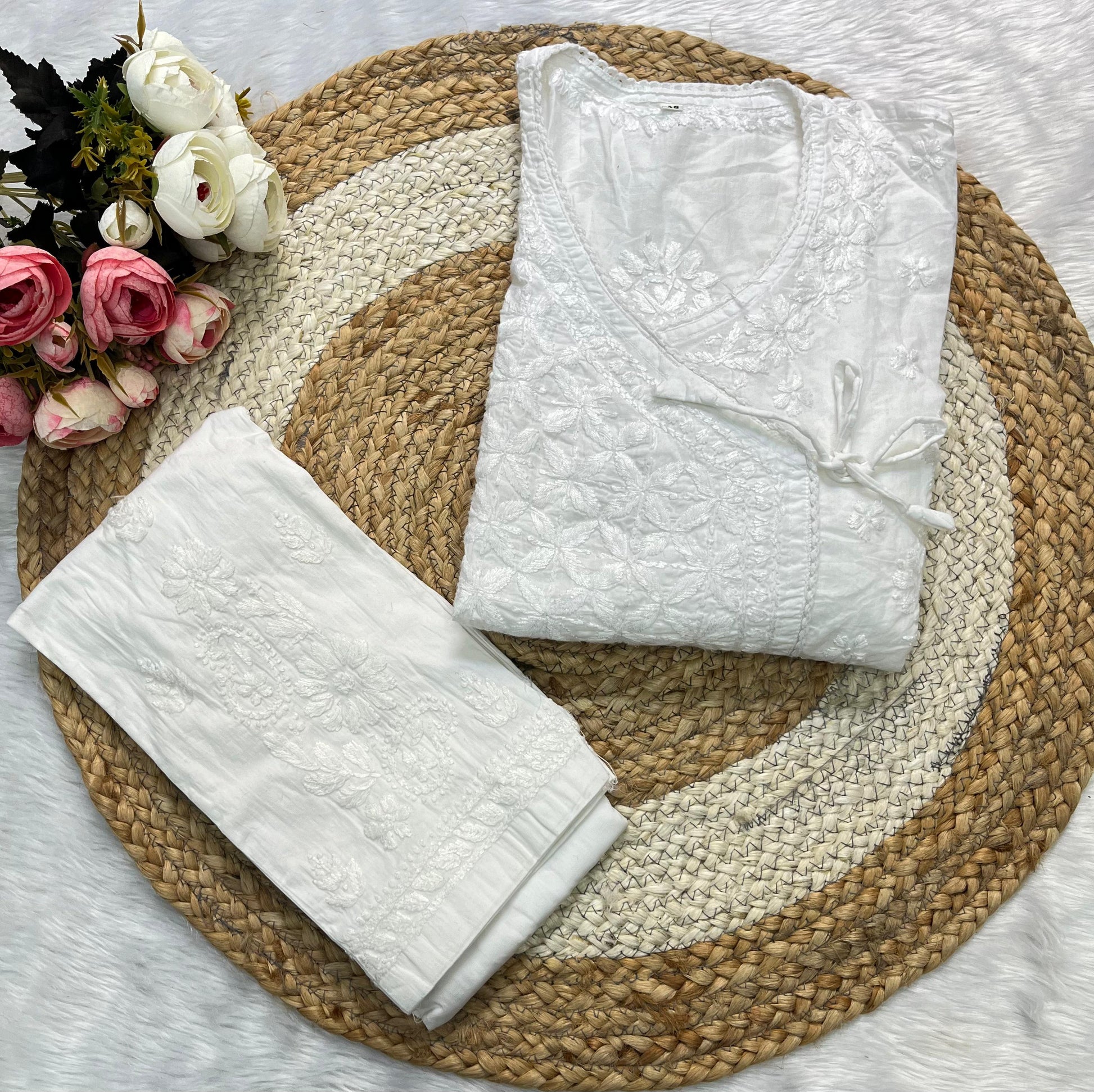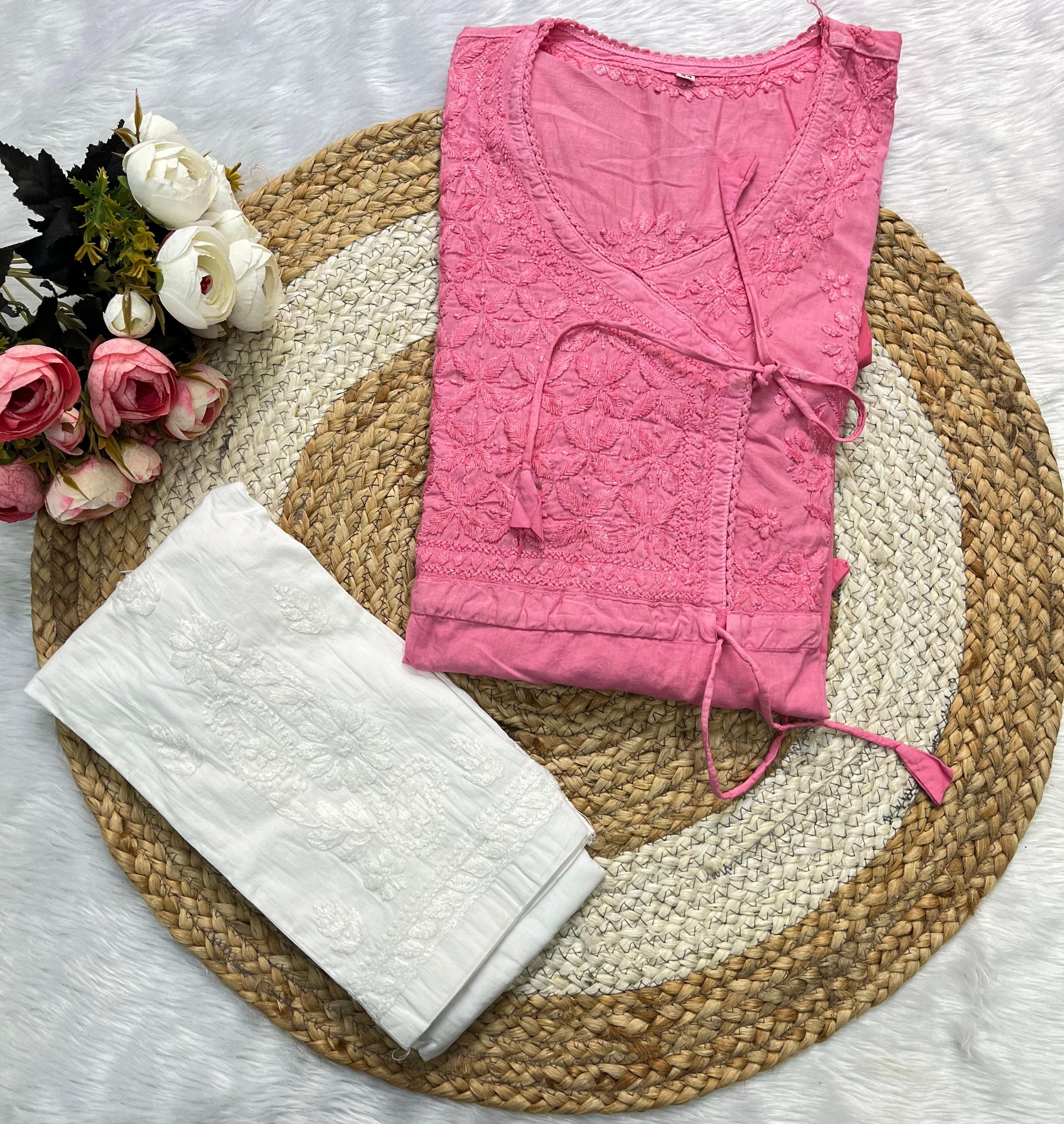 - Design: Featuring intricate Chikankari embroidery, each stitch tells a story of artistry and elegance. The overlapping Angarkha style, complete with delicate tassels or tie-ups, adds a regal touch to this classic silhouette.