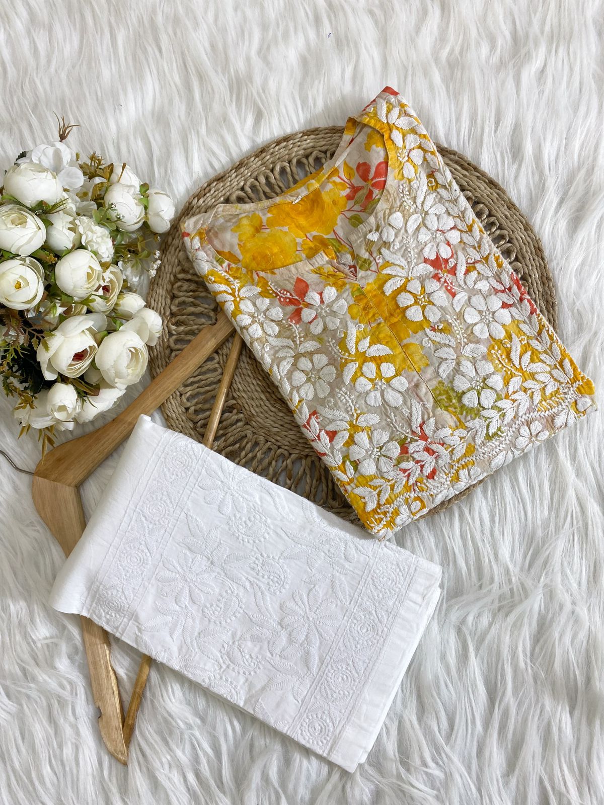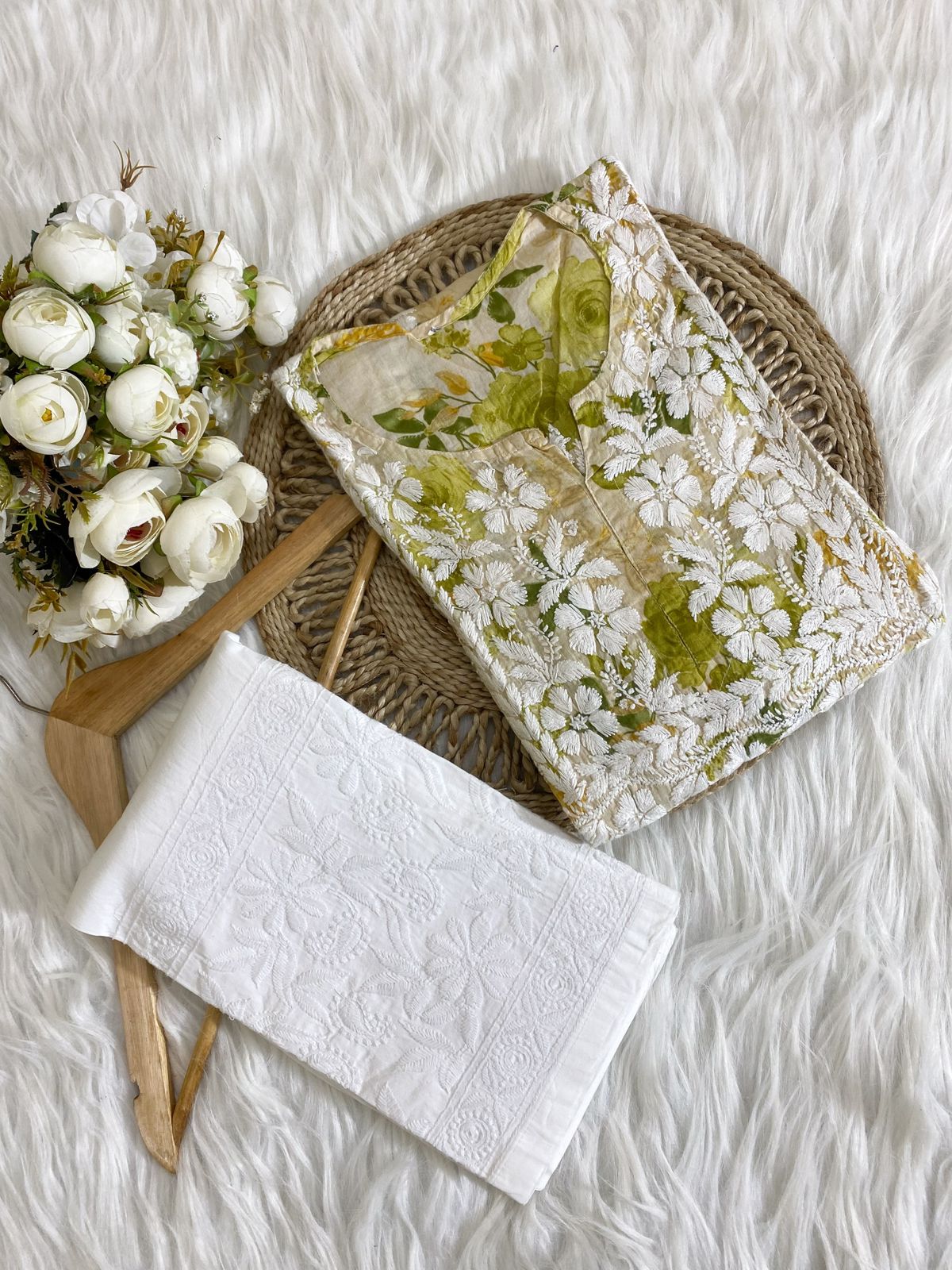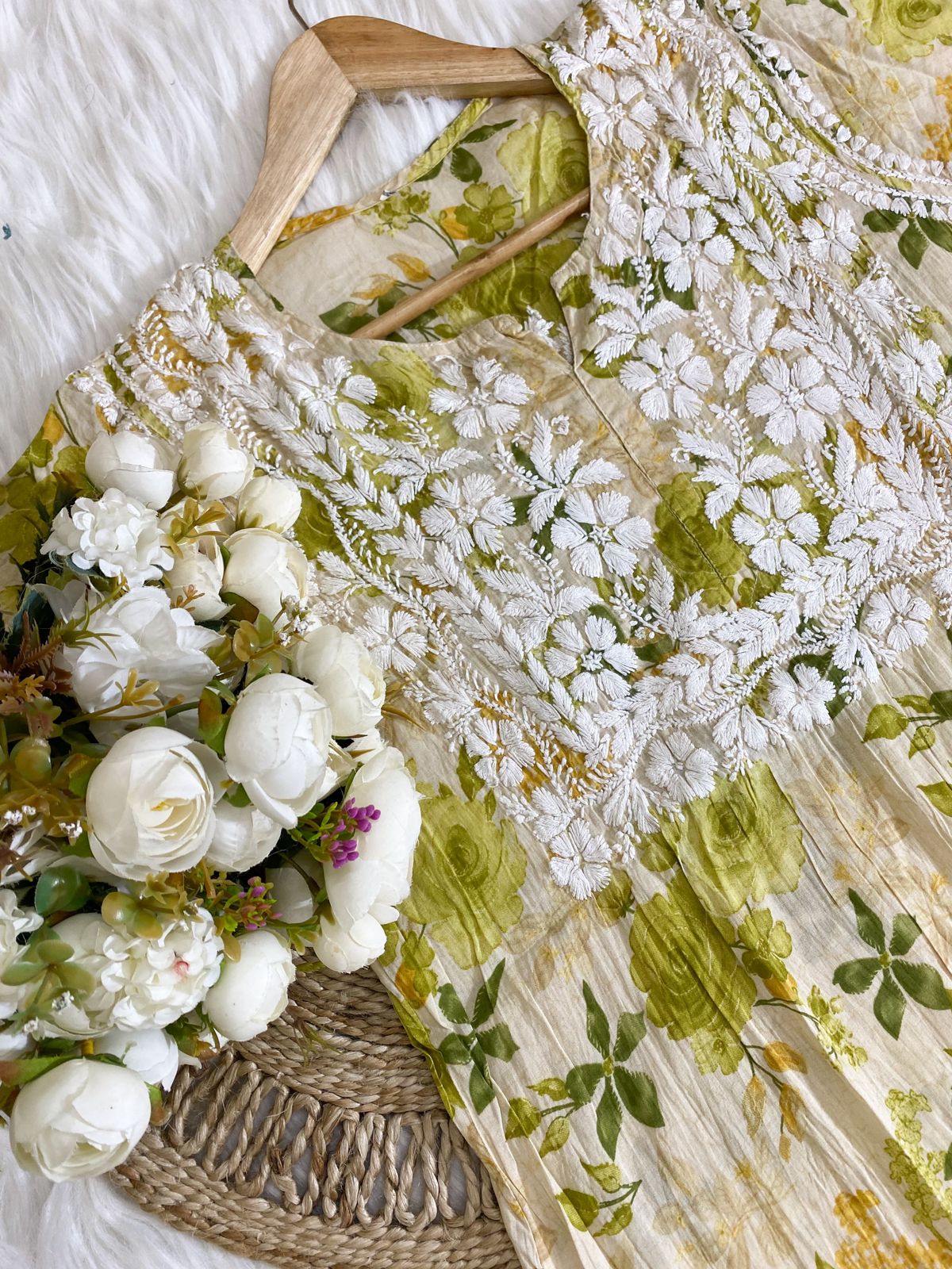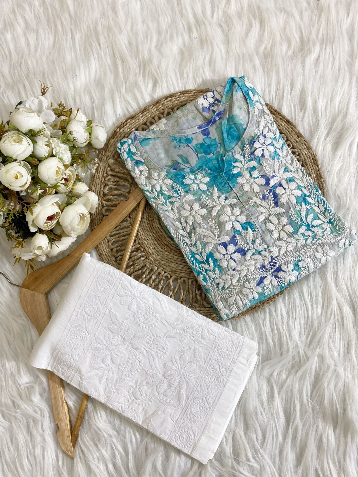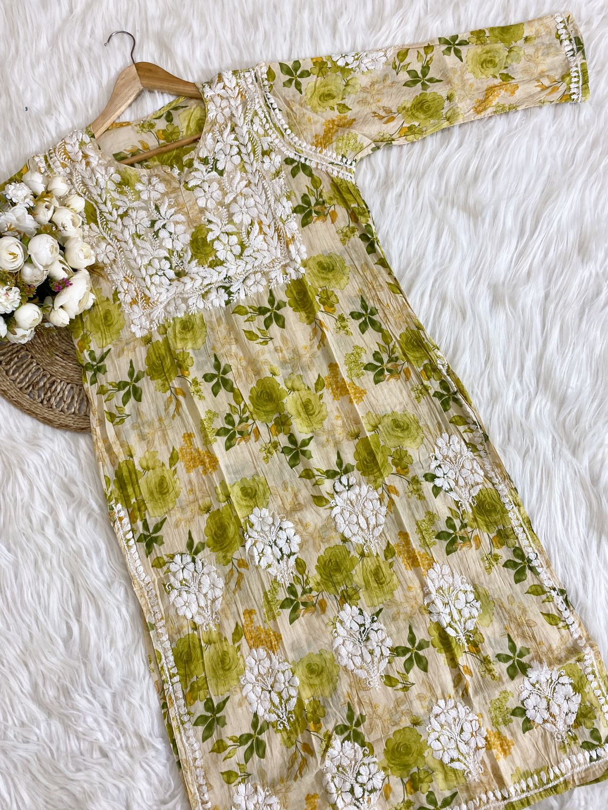 - Design: Adorned with intricate Chikankari embroidery, the kurti showcases traditional floral and paisley patterns, meticulously hand-stitched to perfection. The simple yet elegant silhouette ensures a flattering fit for all body types.