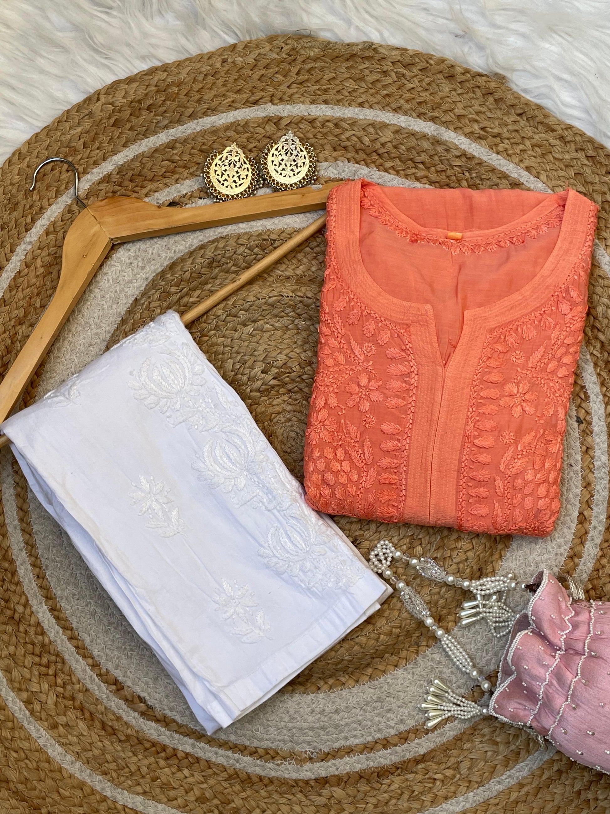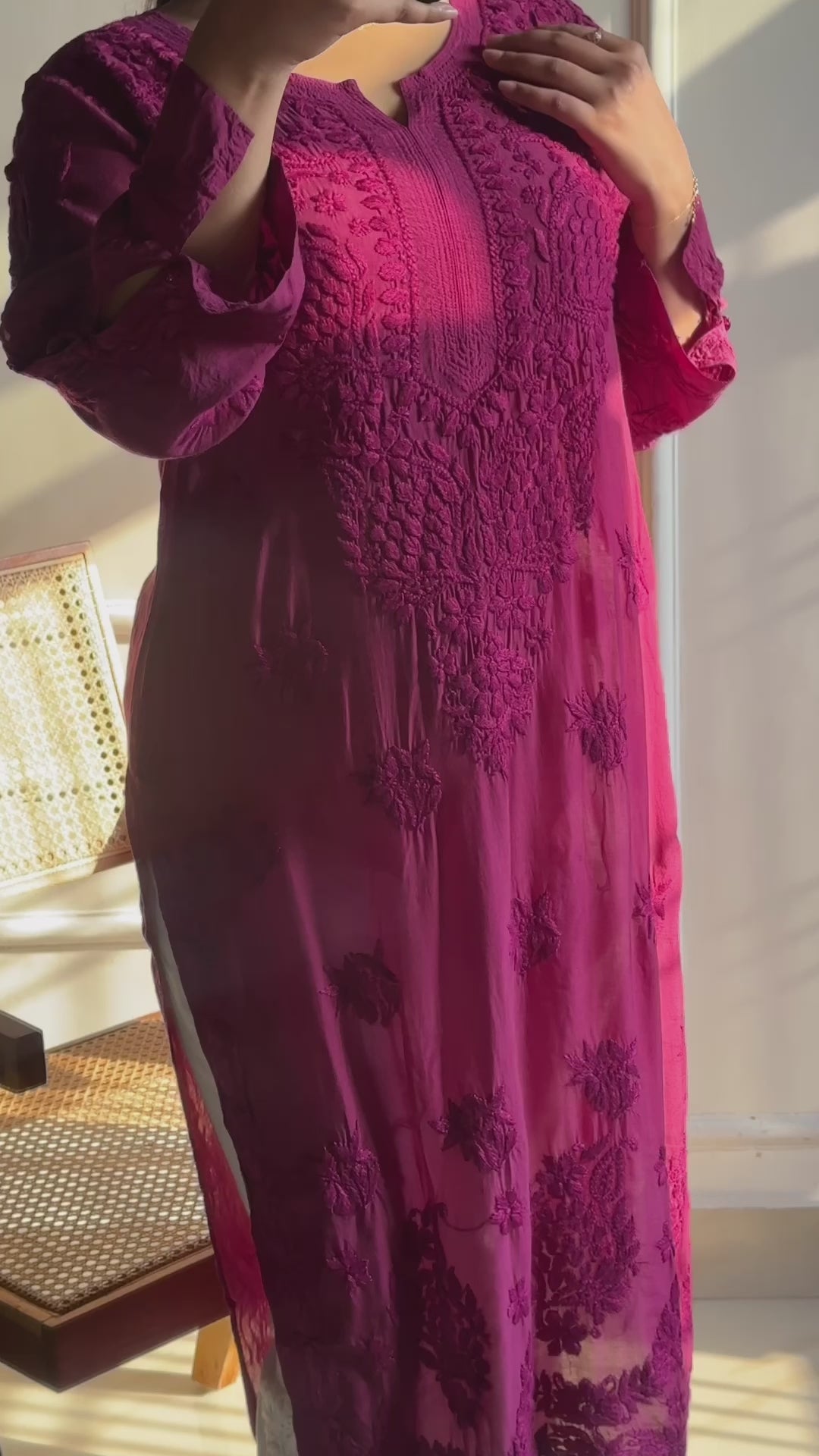 Step into effortless elegance with this lightweight, butter-soft dyed muslin kurti, designed to redefine contemporary Chikankari. Featuring luxurious 3D handwork and a sleeve slit cut-open design, this piece is beautifully detailed with full sleeves adorned with delicate resham buttons. A fresh concept in ethnic fashion, blending grace with modern aesthetics.