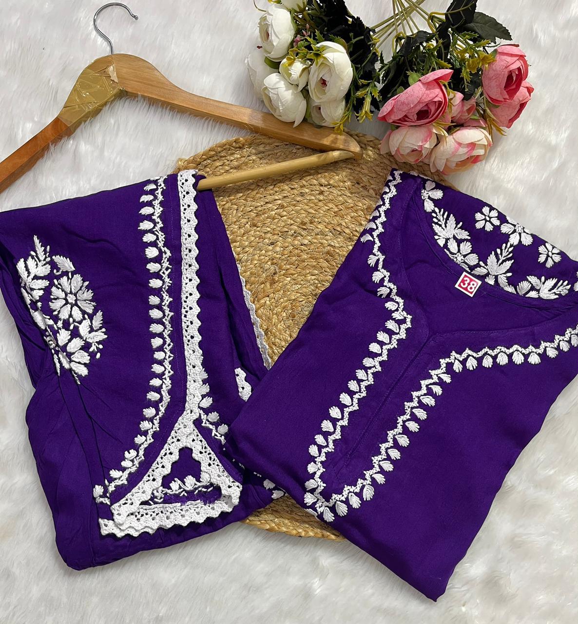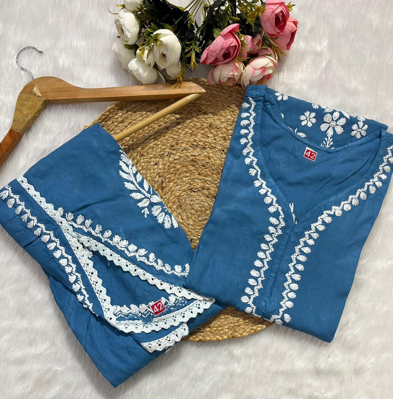 Make a statement with this effortlessly stylish Rayon Co-ord Set with Chikan Embroidery, where comfort and tradition unite in a trendy silhouette.