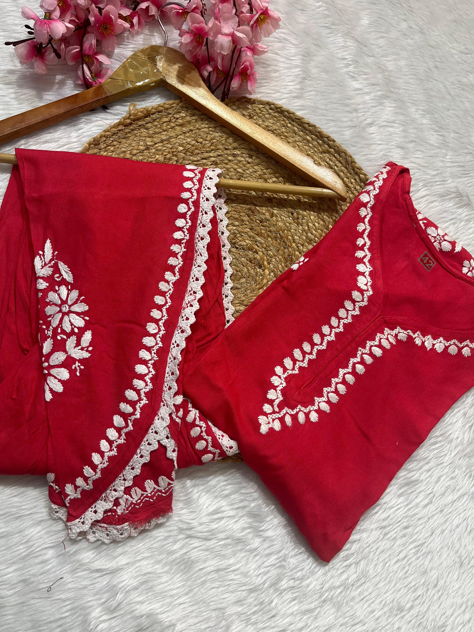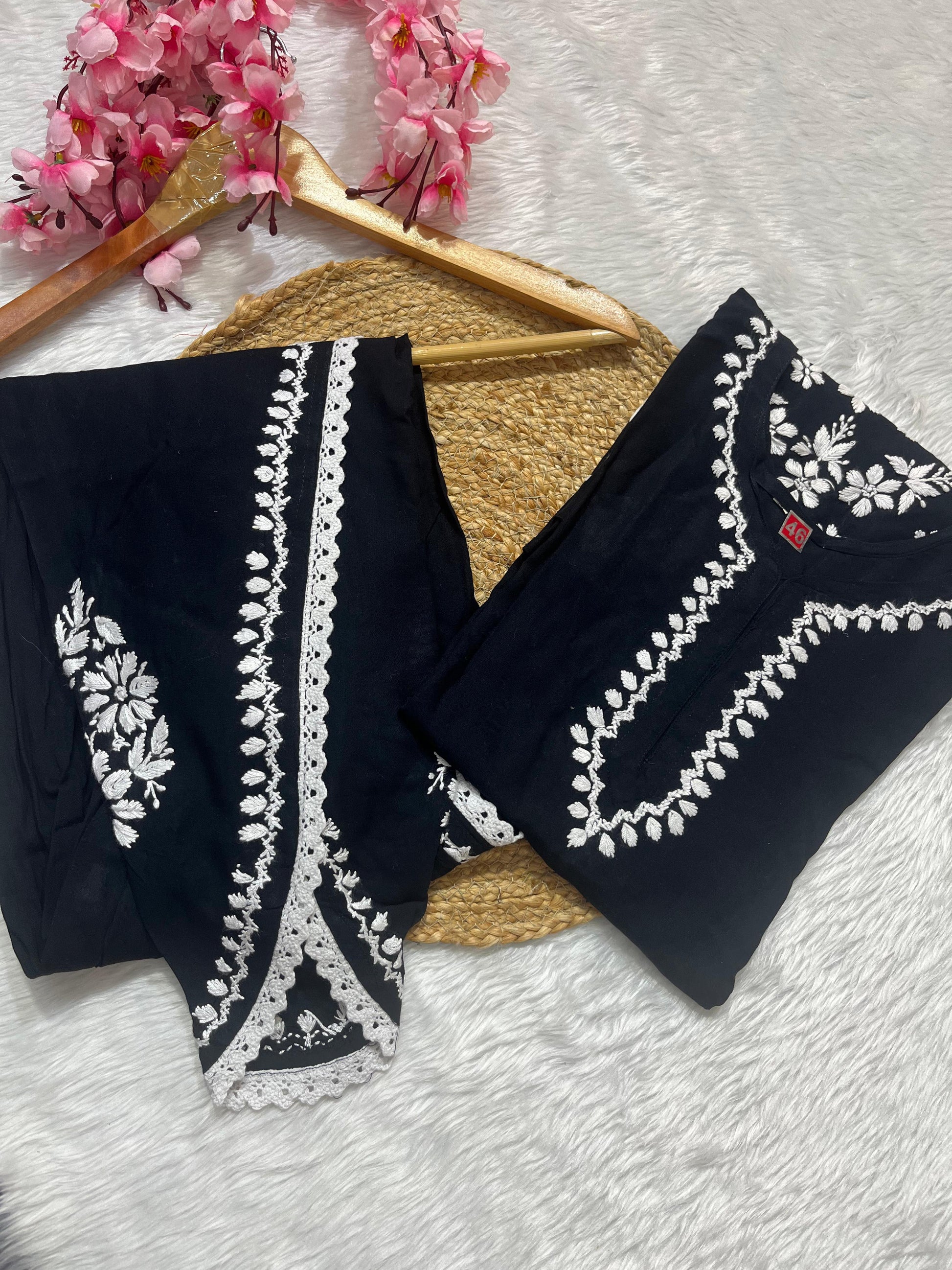 Elevate your casual and semi-formal wardrobe with our chic Rayon Co-ord Set with Chikan Embroidery. Crafted from soft, breathable rayon fabric, this set ensures comfort while offering a stylish, coordinated look. The Chikan embroidery adds an element of elegance and traditional charm to the modern co-ord design. Perfect for day outings, casual meetings, or evening gatherings, this set is versatile and effortlessly stylish.