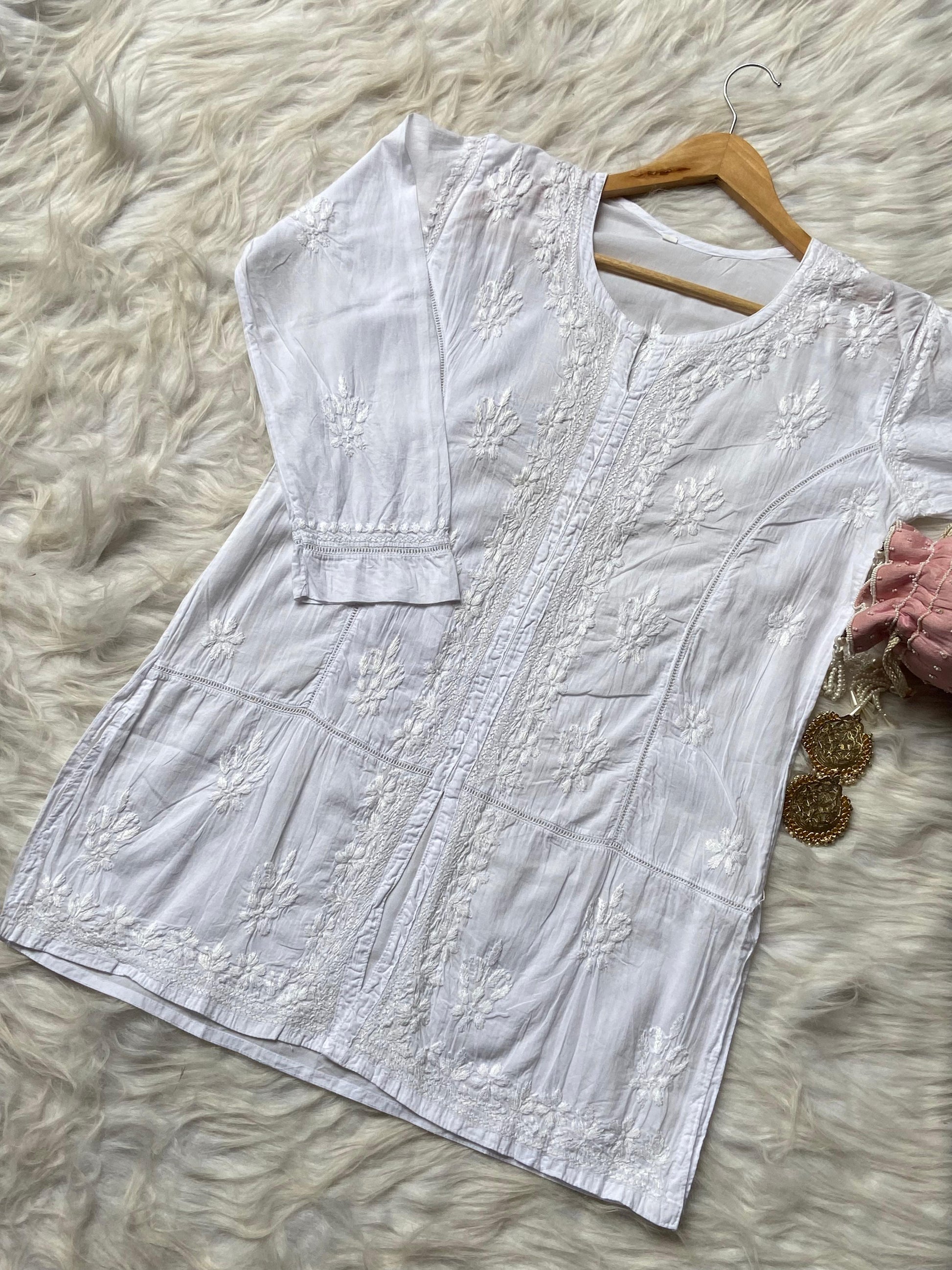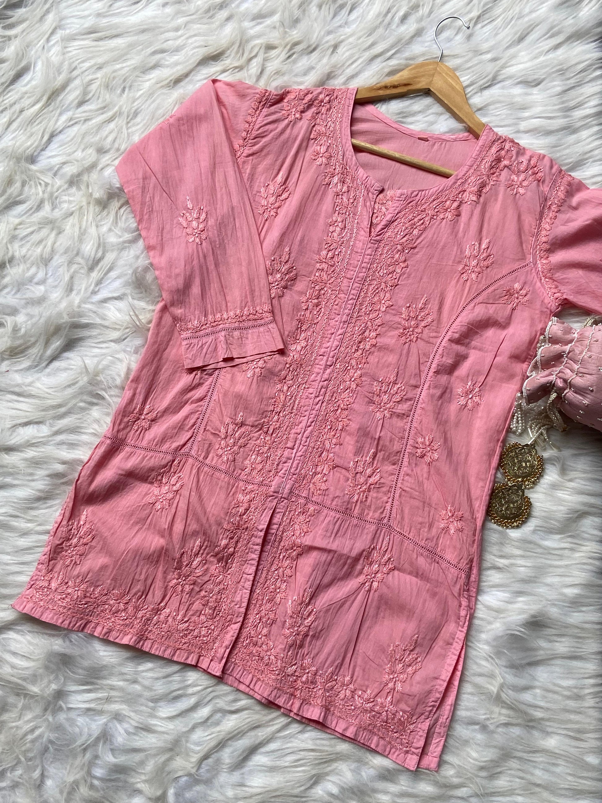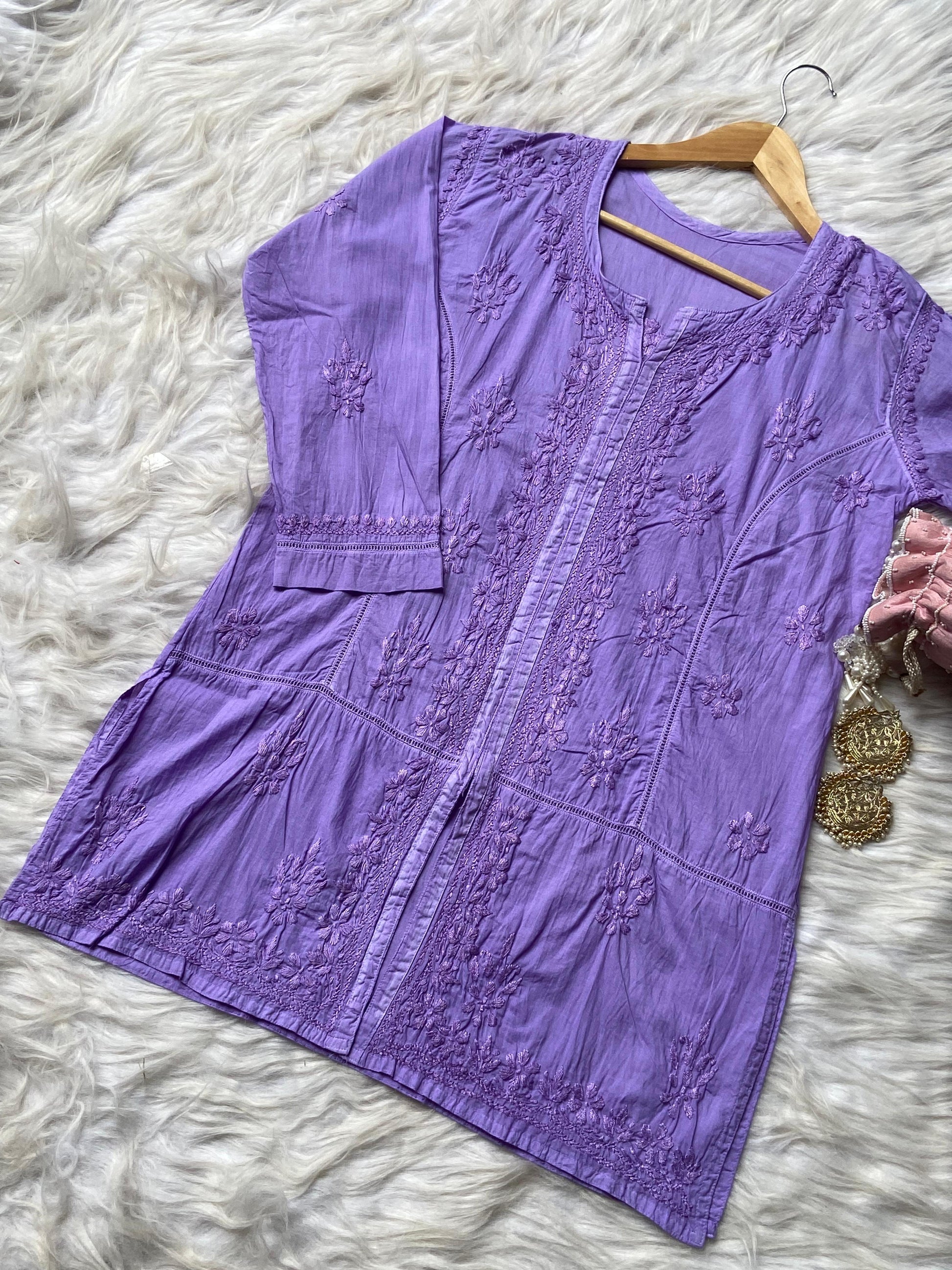 Embrace sophistication with our Premium Special Lightweight Mul Cotton Front-Open Short Top, designed to exude grace and charm. This masterpiece combines delicate Chikan embroidery, intricate lace detailing, and luxurious fabric for a standout look.
